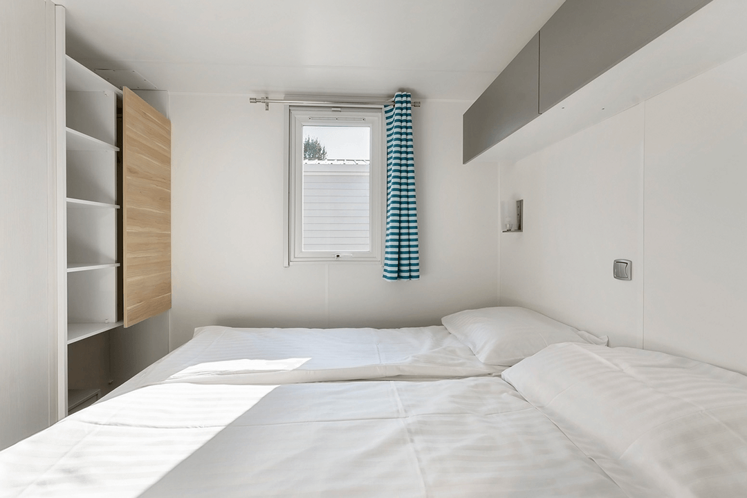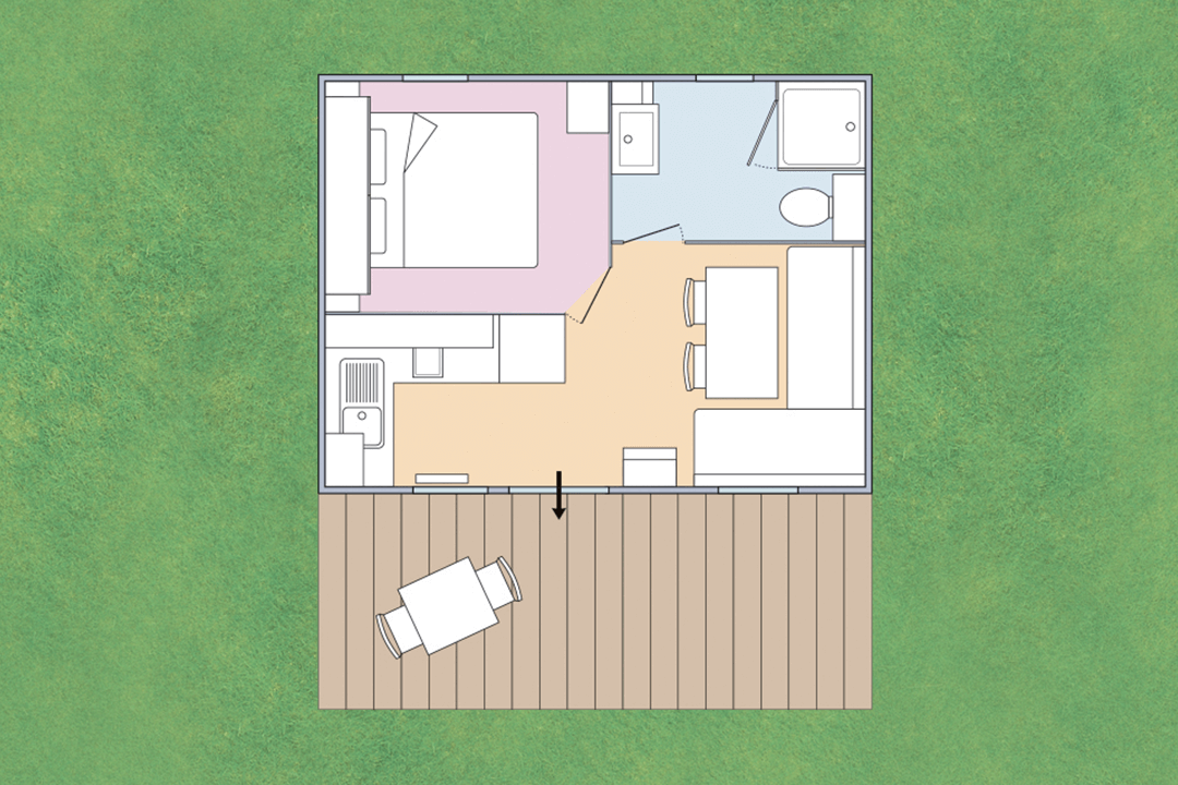 Bungalow für 4 Personen (mindestens 2 Personen), 34 m² gross, mit überdachter Terrasse von 20 m². Im kleinen Schlafzimmer kann das Einzelbett durch ein Babybett ersetzt werden. Alternativ besteht die Möglichkeit, ein Schutzgitter am Bett anzubringen.